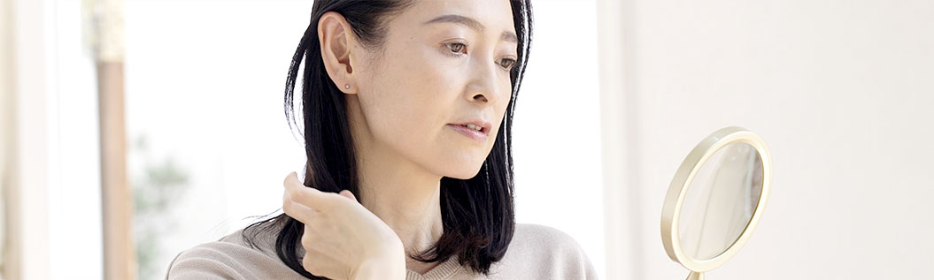 加齢とともにエストロゲンが減少するとヘアサイクルが乱れ、髪の毛の成長期が短くなり、毛が早く抜けてしまったり、休止期が長くなり新しい髪が生えてこなくなったりします。
