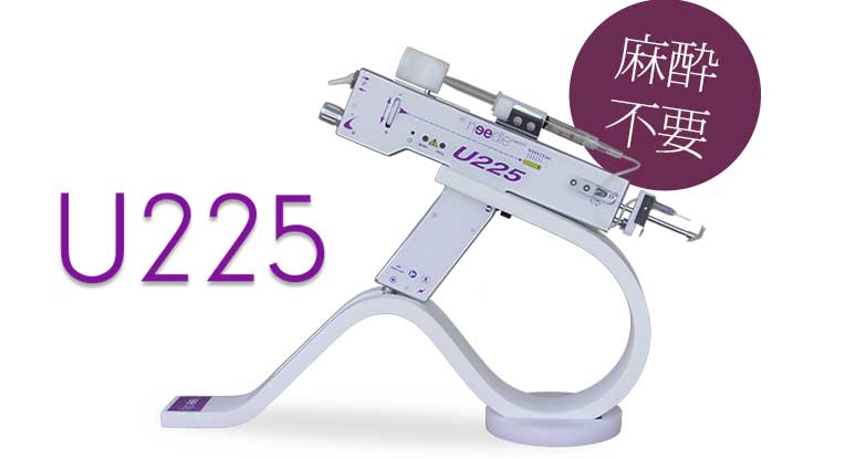 「U225(メソガン)」は、フランス製の高品質な注入専用の機器です。通常の注射とは違い、薬剤をムラなく・一定の深さでお肌に均等に届けることができるのが特徴です。そのため、薬剤がしっかりと必要な場所に届き、より効果的な治療が期待できます。