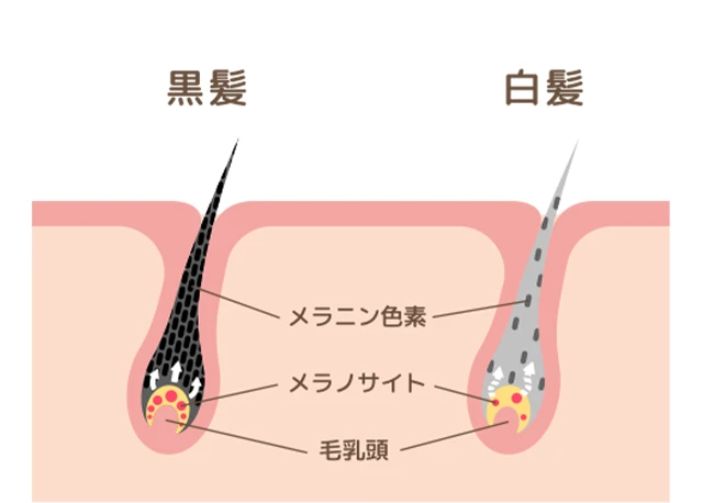 本来、メラノサイトが産生するメラニン色素によって髪は黒く保たれています。しかし、加齢やストレス、栄養不足、血流低下などの影響により、その働きが弱まると、色素を失った白い髪が生えてきます。
