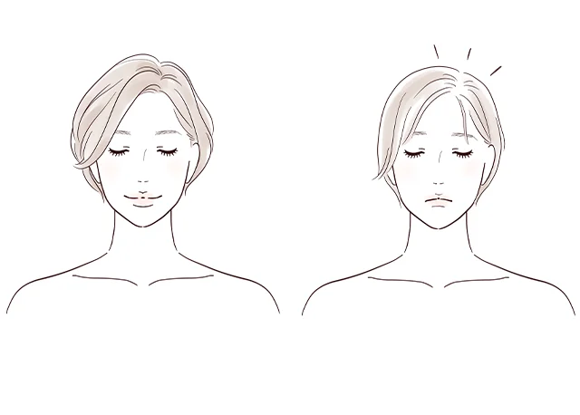 びまん性脱毛症では、髪全体が均一に細くなり、量が減っていきます。「なんだか髪がぺたんとする」「シルエットが小さくなった」という変化に気づくことが多いです。分け目や生え際が極端に後退するわけではなく、全体的なボリューム不足で老けた印象が感じられるようになったら可能性が高いです。